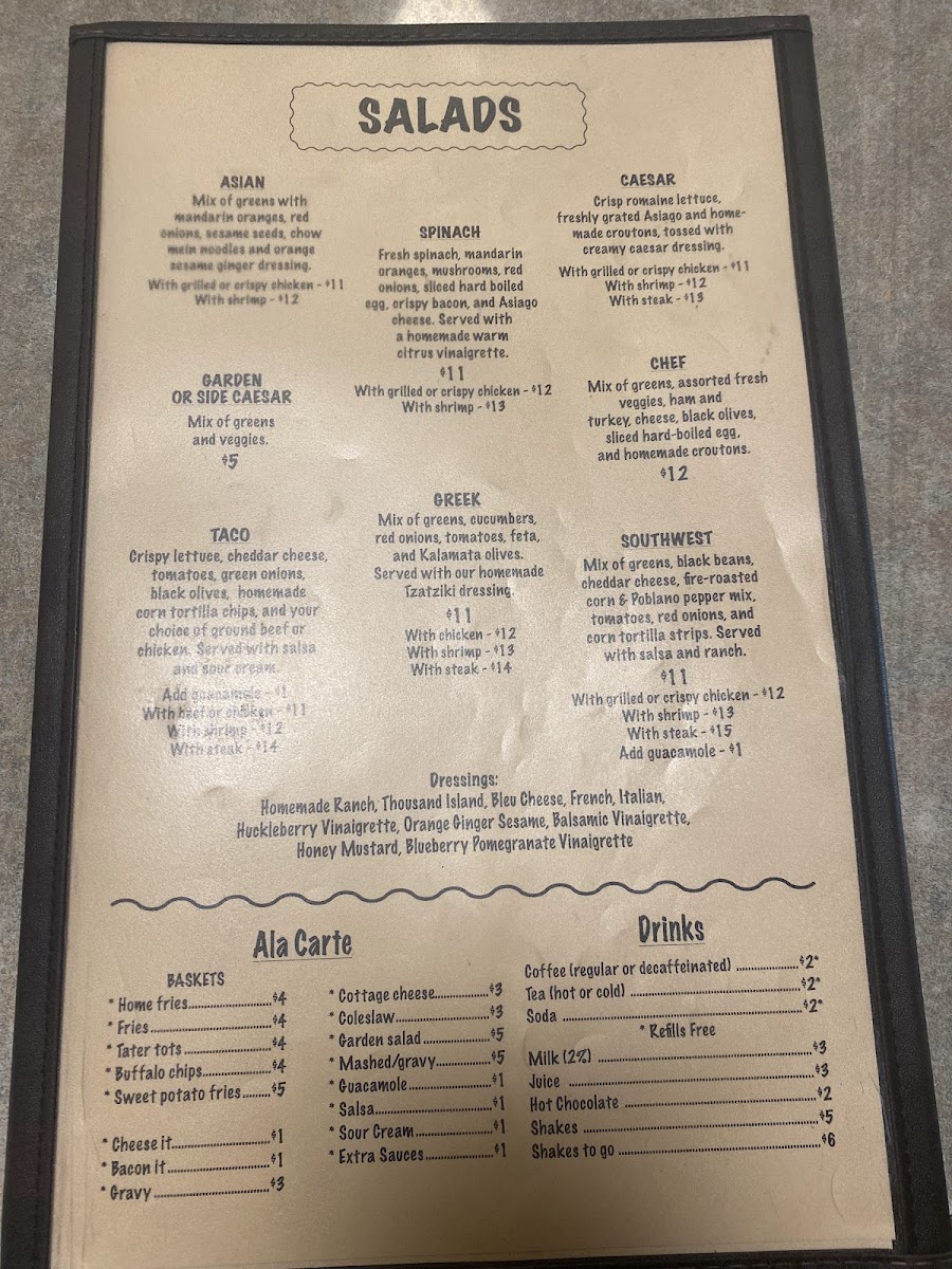 Menu highlights include comforting options like rich clam chowder, the Farmhouse Burger, and homemade pies, which reflect the café’s homey vibe. Fresh salads such as the Greek or Taco Salad provide lighter choices, while more substantial fare like the French Dip or Santa Fe Chicken cater to those looking for a fulfilling meal. Simple starters like beer-battered onion rings or shrimp cocktail are easy to share and set a relaxed tone for the meal.
